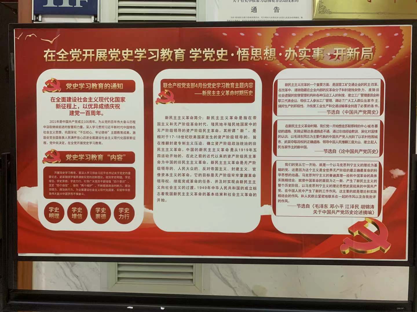 自黨史學(xué)習(xí)教育開(kāi)展以來(lái),聯(lián)合產(chǎn)權(quán)黨支部通過(guò)制定學(xué)習(xí)計(jì)劃、制作月度學(xué)習(xí)宣傳欄、組織黨員定期學(xué)習(xí)討論等方式持續(xù)推進(jìn)學(xué)習(xí)教育工作。下一步,聯(lián)合產(chǎn)權(quán)黨支部將繼續(xù)深入開(kāi)展黨史學(xué)習(xí)教育主題活動(dòng),切實(shí)把黨史學(xué)習(xí)教育與總結(jié)經(jīng)驗(yàn)、觀(guān)照現(xiàn)實(shí)、推動(dòng)工作結(jié)合起來(lái),切實(shí)做到學(xué)黨史、悟思想、辦實(shí)事、開(kāi)新局,鍛造“不折不扣、不偏不倚”的政治執(zhí)行力,以?xún)?yōu)異成績(jī)迎接建黨一百周年。