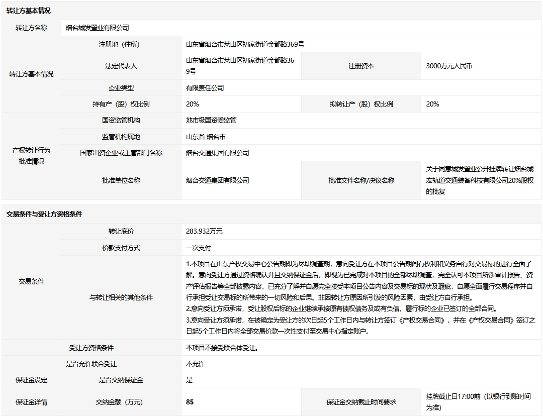 • 轉(zhuǎn)讓方:煙臺(tái)城發(fā)置業(yè)有限公司