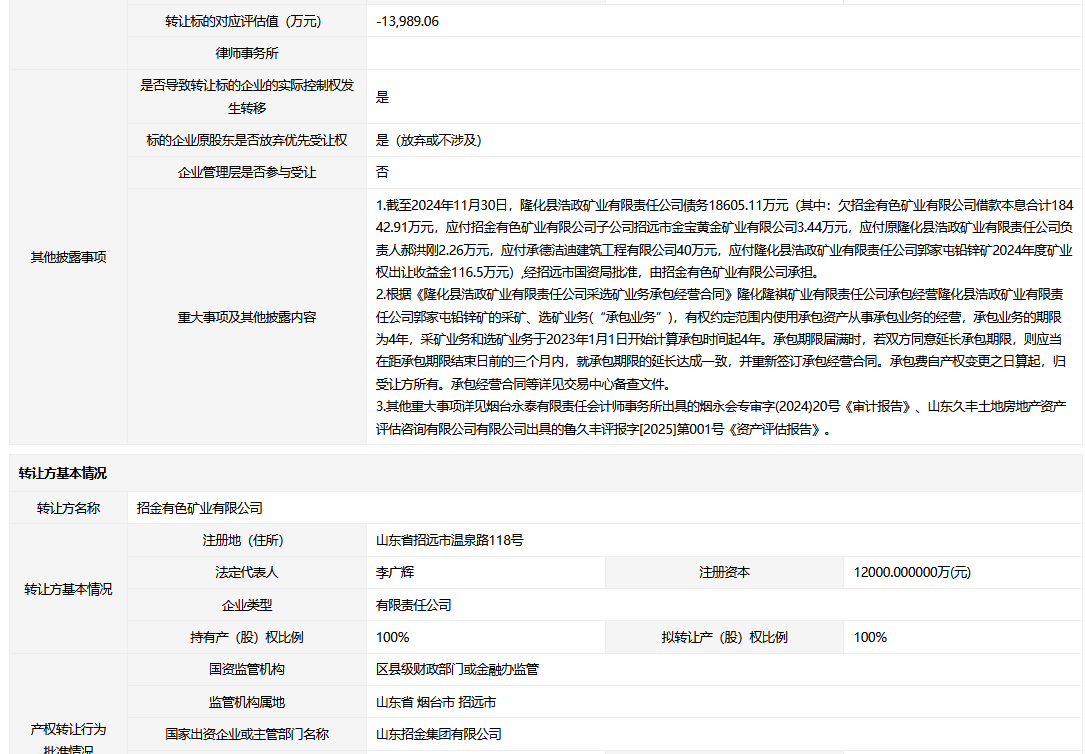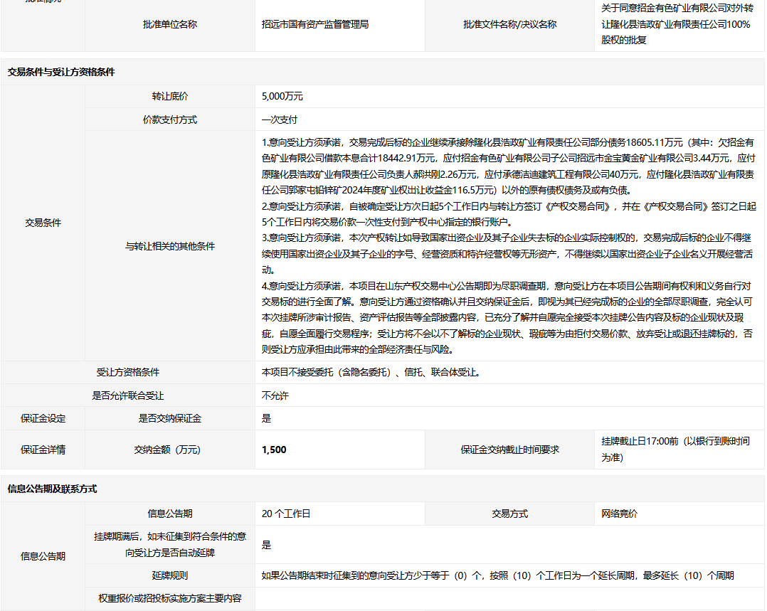 • 轉讓方:招金有色礦業(yè)有限公司